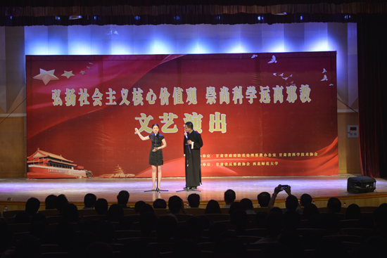 6月12晚,学校和甘肃省反邪教协会联合举办以“弘扬社会主义核心价值观 崇尚科学 远离邪教”为主题的宣传演出活动。省委政法委副书记、省政府防范处理邪教办公室主任金祥明,省科学技术协会党组书记、第一副主席陈炳东,省政府防范处理邪教办公室副主任梁正伟和我校党委副书记刘玉泉等及相关职能部门负责人、各学院党委副书记、辅导员、学生共400余人观看演出。
