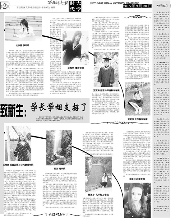 11月6日,中国高校校报协会公布2017年中国高校校报好新闻评选结果。由西北师大党委宣传部(新闻中心)牛丽杰老师编辑的《西北师大报》总第479期第二版“大学时代——致新生”获版面类二等奖,陈祺蔚同学的摄影作品《温暖2017》获摄影类三等奖。